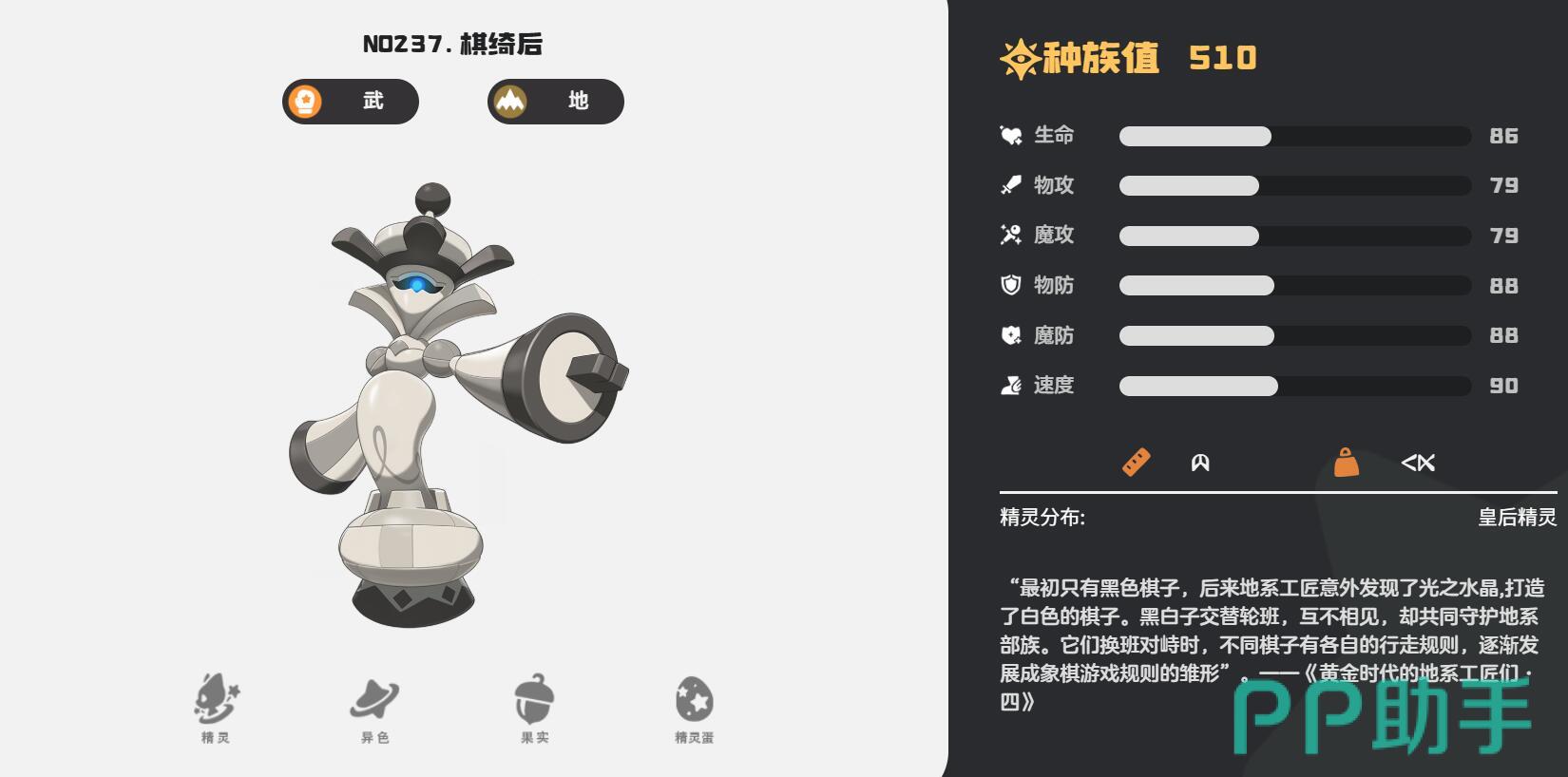 第三位登场的是棋绮后,具备武与地双重属性,速度为90,双防均为88,双攻79,整体属性分布均衡。其独特的棋子形态可能触发特殊控制效果(具体需通过技能解锁实现),在PVP环境中常用于先手控场,打乱敌方部署节奏,具备较强的战术干扰能力。