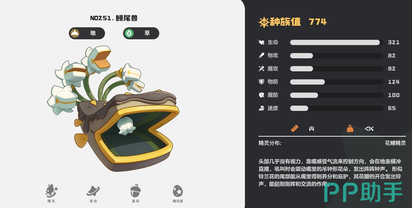 第四位是鳗尾兽,拥有草与地双属性,总种族值高达774,生命值321,物防124,是当前地系中最耐打的精灵之一。其携带的花朵铃铛可为团队提供增益状态,配合321点基础生命值以及寄生种子技能,可在野外轻松应对多数草系对手。推荐刷满生命与物防努力值,性格选择淘气以增强生存稳定性。