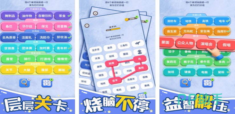 脑动词场是一个趣味性比较强的消除游戏,一般的消除玩法都是消除各种物品,但是在脑洞词场这个游戏里,设定了大量的词语,玩家需要把类别相同的词语移动到一行,这样整行都会被消除,接着系统会补位更多词语,大家可以在游戏里通过不断消除累积积分,是一个非常考验玩家脑力,并且可以发掘深层次关联的手游。