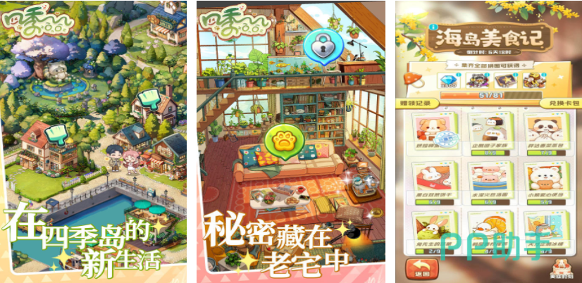 四季合合设定了一个插画风格的场景,在这里玩家将会来到一个无忧无虑的岛屿,在这里可以自行进行岛屿的建造,岛屿整体的布局风格玩家都可以自由打造,另外在这个岛屿上,玩家还能修建一个专属于自己的房屋,在房屋里会隐藏着各种秘密,玩家可以在这里不断探索完成解谜,另外还有美食制作的设定,每个成员都能大展身手,制作各种特色的美食。
