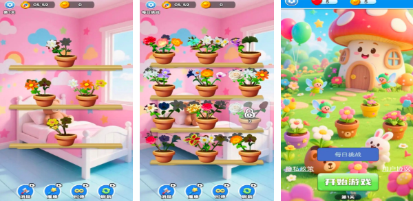 这是一款融合三消玩法的休闲养花游戏,《鲜花之家》以3D画面呈现超过30种可爱花卉,玩家可通过合成花束解锁图鉴内容。每日挑战模式结合消除机制,让种花过程更具节奏感。四种辅助道具——消除、刷新、暂停等,帮助你顺利通关高难度关卡。伴随悦耳的原创音效,与灵动的小花仙子一同开启一段清新有趣的冒险旅程。