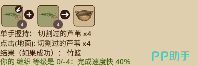 获得材料后,将燧石原石放置于地面,手持圆石对其进行敲击操作,成功后可得到两块燧石刀刃。随后使用其中一块刀刃前往芦苇丛,采集四棵芦苇(即两组,每组两棵)。将一组芦苇置于地面,再手持另一组与其交互合成,即可完成竹篮的制作。