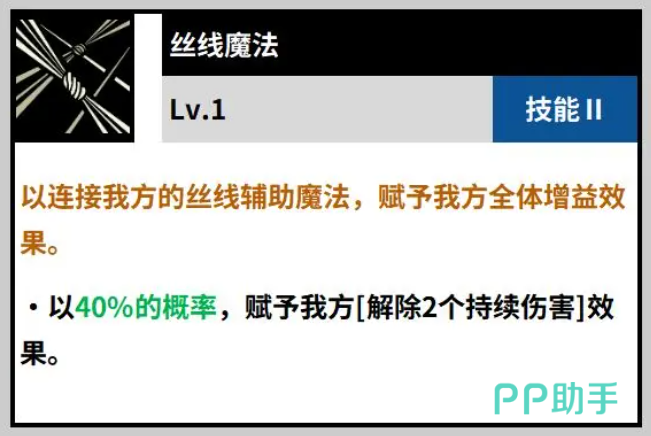 凡妮莎的技能2叫做丝线魔法,这个丝线魔法需要的冷却时间比较长,只有3个回合冷却之后才可以再次使用,使用的时候可以连接到整体的丝线,然后用辅助魔法的能力给我方的全体队友都带来一定的增益,此时在队友身上会带来防御力增加的增益,这个防御力会持续两个回合都得到增益的数值,其中会以40%的触发概率,来给我方的队友带来一个驱散的效果,在其中可以解除两个持续伤害类型的效果,所以如果对面敌人如果控制类型技能比较多的,她的这个技能就可以多次使用了,而在在防御力增加之后,自身还会有140%的数值提升。