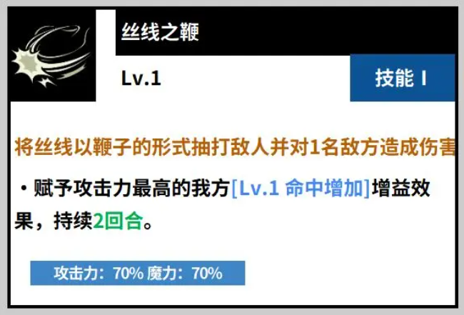 凡妮莎在目前的游戏当中是作为一个支援定位使用的角色,在技能上面有一个丝线之变的技能,使用这个技能的时候能够先对敌人进行一个输出,那么此时针对的敌人只有一名目标,造成的攻击力可以达到80%的数值,然后在上面以丝线的以用丝线将鞭子的形式来进行抽打,在攻击完成造成伤害之后,还可以赋予一个队友增益,给队友带来属性增加的增益效果,当然这个我方队友是要选择己方攻击力最高的一个队友,这个增益是可以持续两个回合的,给他增加这个命中增加增益之后,这个目标在命中能力上面是有25%的提升效果。