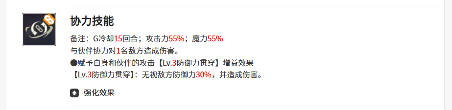 那么在她的协力技能上面,大家可以冷却的回合也是非常长的,但是这个能力的话,大家可以跟伙伴协力共同使用,此时在上面带来的攻击能力也达到了55%,这里可以跟伙伴协力对一名单位敌人进行暑促胡,带来的一定的伤害是基础效果,然后带来的是给自身以及同时协力的这个伙伴带来的增益,在自己以及伙伴的增益效果上面,则是一个防御力贯穿的能力,此时可以无视敌方的防御力,而且忽视的数据达到了30%,并且在此基础上还可以造成额外的伤害。
