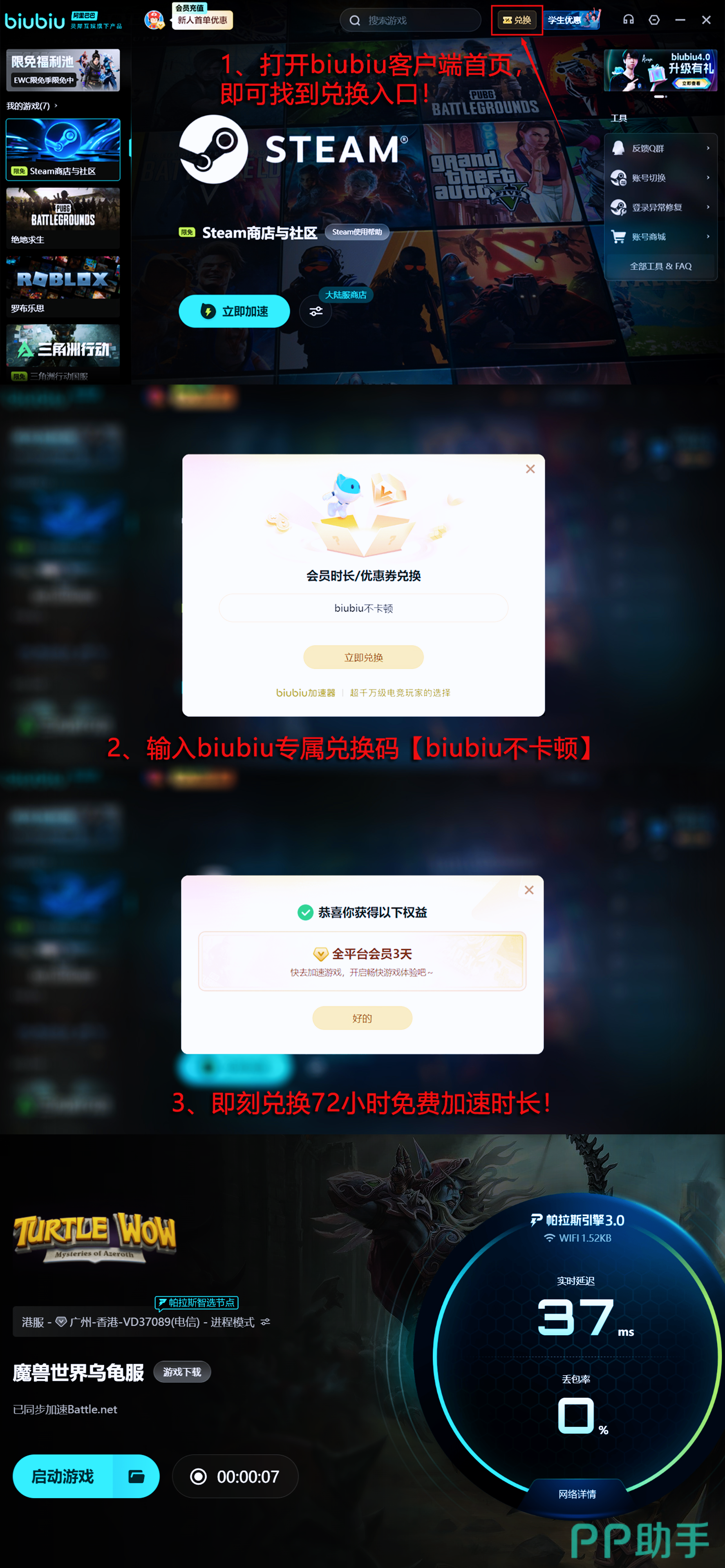 新用户注册biubiu后即可领取24小时免费加速时长,不仅有助于解决地图进入难题,在后续PVE和PVP过程中也能显著改善卡顿现象。此外,无论是新用户还是老用户,输入兑换码【biubiu不卡顿】均可额外获得3天免费使用资格,足够全面体验加速服务带来的流畅感。