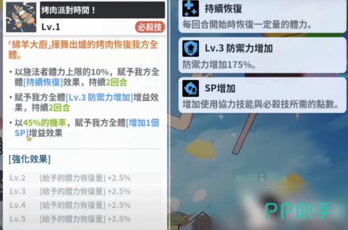 恰米的必杀技也就是大招叫做烧烤派对时间,大招效果会针对全体的队友带来治疗以及增益,增益是放在防御上面进行加持的,这里的话也可以配合概率的效果进行使用,这样整个队伍在一些打持久战的情况下,也可以保证自己技能冷却的时间比较,适合进行循环,后期也可以越打越稳,那么在觉醒之后,她的被动效果就是在每个回合结束之后才可以触发,此时如果队友身上的血量数值比较低的情况下,恰米还可以为这个角色带来恢复的能力,当然这里恢复的话只能带来最大生命值3%的数值回复,这还是达到了2级觉醒才可以带来的数值。