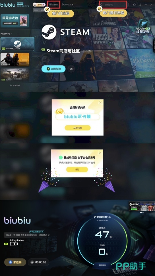 该服务已全面接入帕拉斯引擎3.0技术架构,有效降低数据传输延迟,实现毫秒级响应效率。新用户注册即可获得24小时免费试用权限,无需任何门槛即可体验高效加速;输入专属口令【biubiu不卡顿】还可额外领取72小时加速时长。