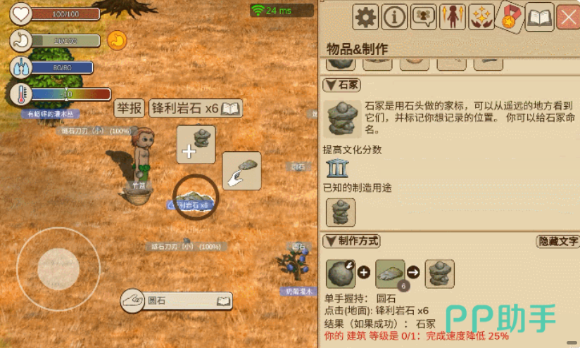 解锁完成后,下一步是准备所需材料:1个圆石和6个锋利岩石。由于采集量较大,建议随身携带竹篮以便集中存放资源,一次性带回所有原料,避免多次往返浪费时间。