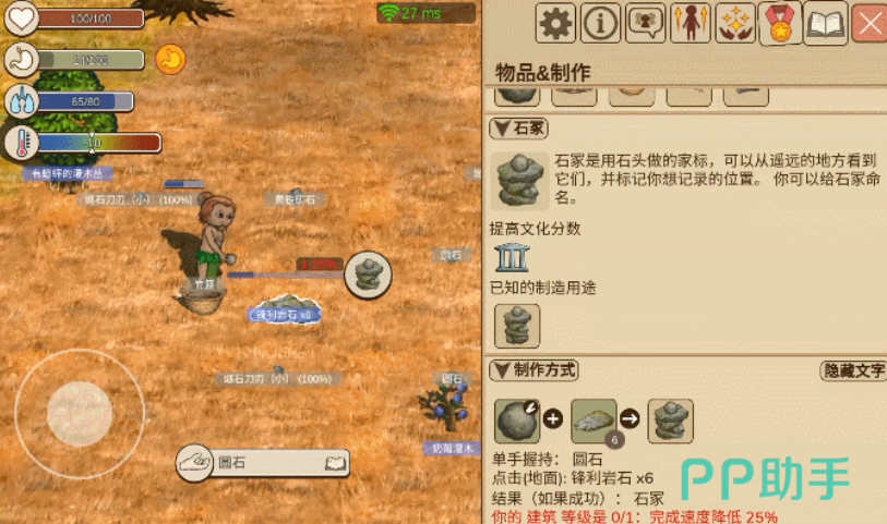 要解锁石冢功能,必须先推进科技树至石器时代阶段的第4层。科技树系统是游戏中实现工具与建筑制作的核心机制,初始状态下并非全部开放,需通过完成指定任务逐步激活后续节点。新人玩家可参考界面中的提示按钮查看当前科技进度及可制作项目。