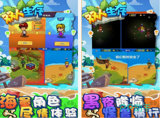 这是一款以双人协作为核心的生存类手游,采用同屏操作机制,玩家将共同扮演角色在荒岛环境中求生。白天需采集木材、石材等资源,夜晚则要面对大量来袭的怪物。必须合理分工,建造防御工事并制作武器才能存活。游戏强调配合与策略,非常适合情侣在合作中培养团队意识,体验共渡难关的真实感。