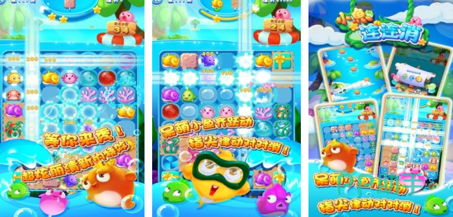 小鱼连连消以海底世界为背景,玩家要在限定时间内,通过滑动手指选择相邻的至少三条颜色相同的小鱼进行消除,随着关卡深入小鱼种类愈发丰富,且会出现各种障碍物增加消除难度,为帮助玩家过关游戏里边还有有多种道具,炸弹道具能瞬间清除一片区域内的小鱼,彩虹小鱼道具可与任意颜色小鱼组合消除,为玩家在各种局面下提供更多消除选择。