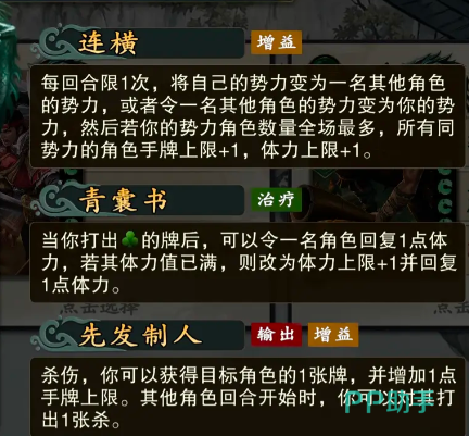 若想进一步增强稳定性,还可补充乱世奸雄、乘马射虎或倾国倾城等辅助类技能,强化整体作战韧性。如果偏好保守发育路线,直接获取防御三件套也是极佳选择。一旦拥有这三项防御技能,角色坦度将极大提升,即便被对手连续攻击也几乎不掉血,能够从容周旋、拖到后期反打。对于擅长苟活流的玩家来说,这套配置无疑是巨大助力,想被击败都极为困难。需要注意的是,像先发制人这类技能,必须通过队友触发,或者在敌方持有左慈时才可成功复制。