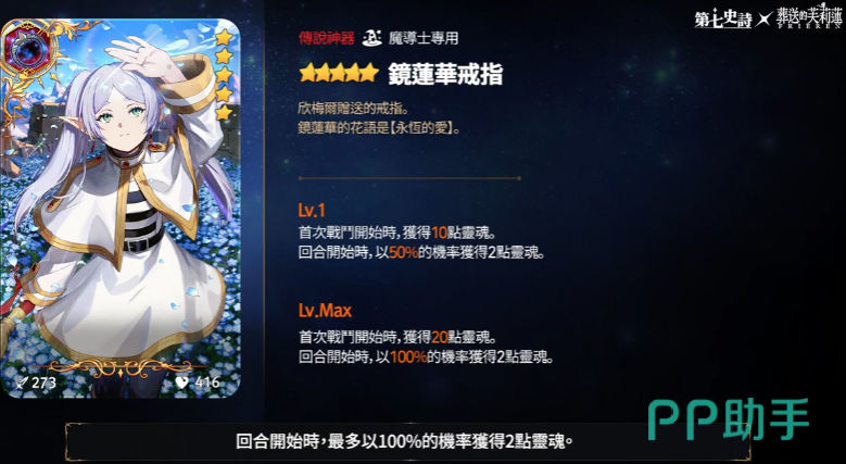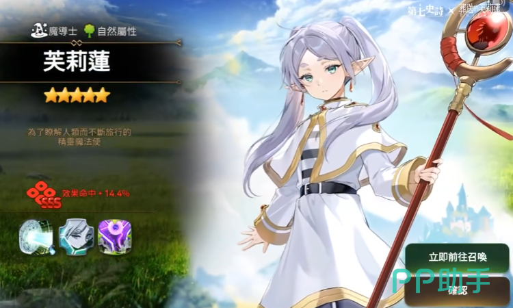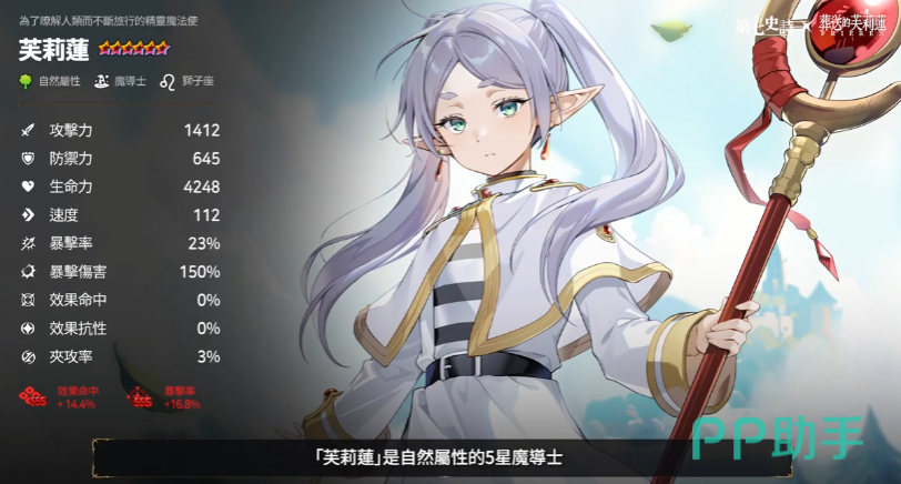 第七史诗和葬送的芙莉莲联动出的芙莉莲,在游戏里是自然属性魔导士,玩的时候能明显感觉到和原作的贴合度,她在队伍里主要是打群体输出的主C,清起杂兵来效率很高,还能顺便给队友补点放技能的资源,让全队技能转得更快,另外还有个免伤机制,不用像有些脆C那样时刻担心被秒,算是输出和生存都能顾到的类型,主动技能基本都是大范围魔法攻击,有时候打中人还会触发额外效果,多段伤害或者小范围扩散,清那种扎堆的怪特别爽,对付精英怪也能一直压着打。