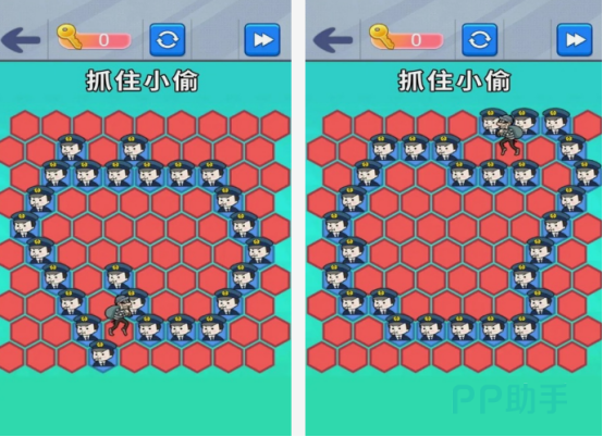 本作是一款策略性较强的休闲益智游戏,核心目标是通过合理布置障碍物,封锁所有可能的逃跑路线,从而成功围捕正在逃窜的小偷。虽然整体操作简单,但关卡设计富有层次感,越往后对预判和布局的要求越高,非常考验玩家的逻辑思维能力和空间判断能力。