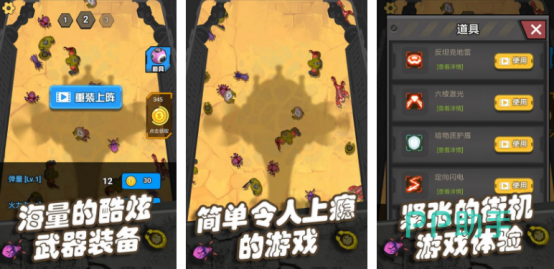 汹涌来潮的僵尸会将你团团围住,看到眼前的一幕时,千万不要有所畏惧,一旦你有害怕之心,就会被所有的僵尸所吞噬。而你却要鼓足勇气,在海量特别炫酷的武器装备中正确操控,比如反坦克地雷或者激光炮等等。点击屏幕并合理滑动屏幕,操控其中的主要角色,用蛇皮走位的方式,将僵尸全部消灭,但千万注意的是不能和僵尸发生碰撞。
