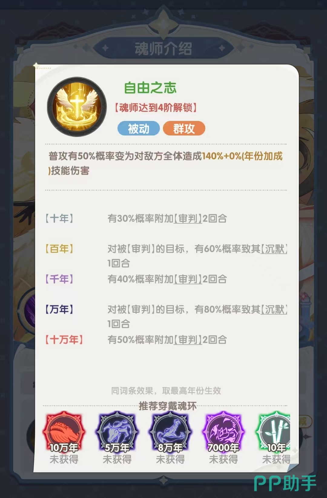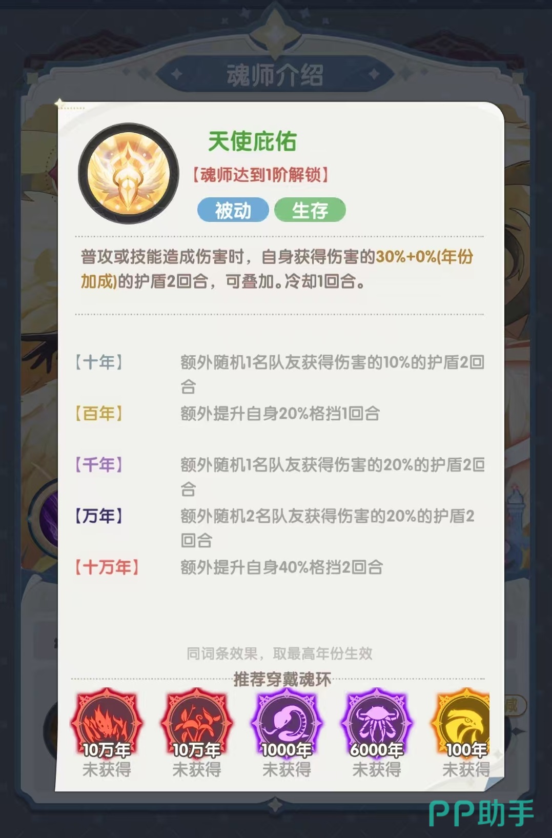 第一个被动“天使庇佑”使得千仞雪在普攻或释放技能造成伤害后,为自己和一名随机队友生成护盾,并提高自身的格挡属性。第二个被动“自由之志”则让普通攻击有机会转化为全屏伤害,并附带审判效果;当攻击已被审判的目标时,还有概率使其陷入沉默,阻止其使用技能,进一步强化控制链。最后一个被动“天使真身”在战斗初始即为自身及两名随机友方单位施加护盾,并永久提升自身与队友的伤害减免。尤其在达到10万年魂环后,该被动带来的减伤收益极为可观。