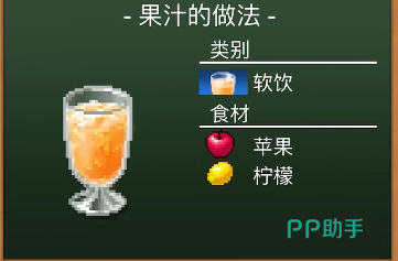 最后是软饮类饮品的配方说明。第一款果汁由苹果、柠檬汁与水混合而成;第二款混合果汁使用牛奶与苹果调制;第三款汽水则是通过碳酸水搭配各类水果制作完成。
