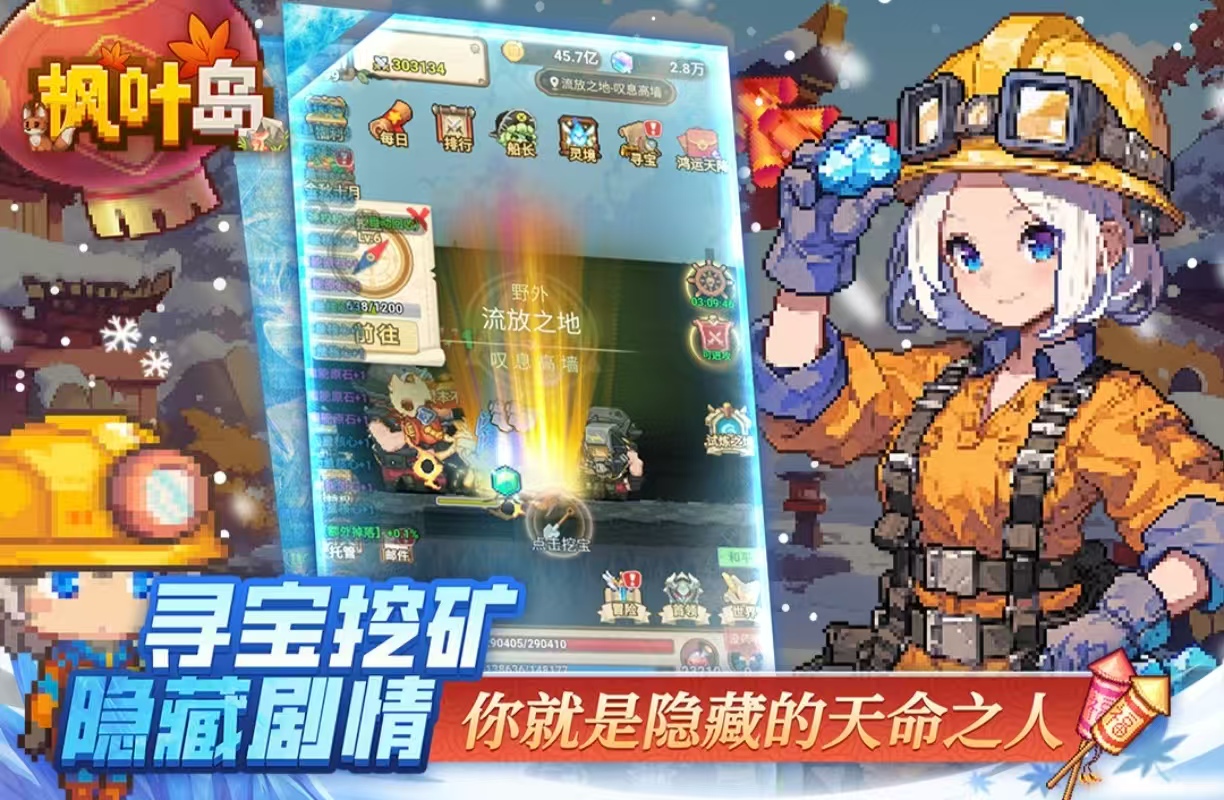 《枫叶岛》采用复古像素画风,设定在一个被遗忘的小镇之中,玩家将与其他幸存者共同展开求生冒险。挖掘矿产、探索遗迹的过程中常会触发隐藏惊喜。与岛上居民对话可推进剧情发展,解锁任务目标。技能系统提供上百种搭配可能,成长路径完全由玩家自主决定。地图中散布着宝箱与珍稀装备,完成特定条件方可获取,个性化装扮也将逐步开放。