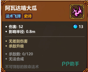 阿瓦达的基础伤害为52点,影响范围半径为0.8米,属于无差别攻击类型,核心优势在于通过击杀敌人实现等级提升。首次升级需累计消灭120只小怪,第二次则需要再击杀240只。值得注意的是,在第一次升级过程中,部分怪物的击杀可能不会被系统计入统计,导致进度缓慢;但从第二次升级开始,所有击杀都会被有效记录,刷新效率显著提升。