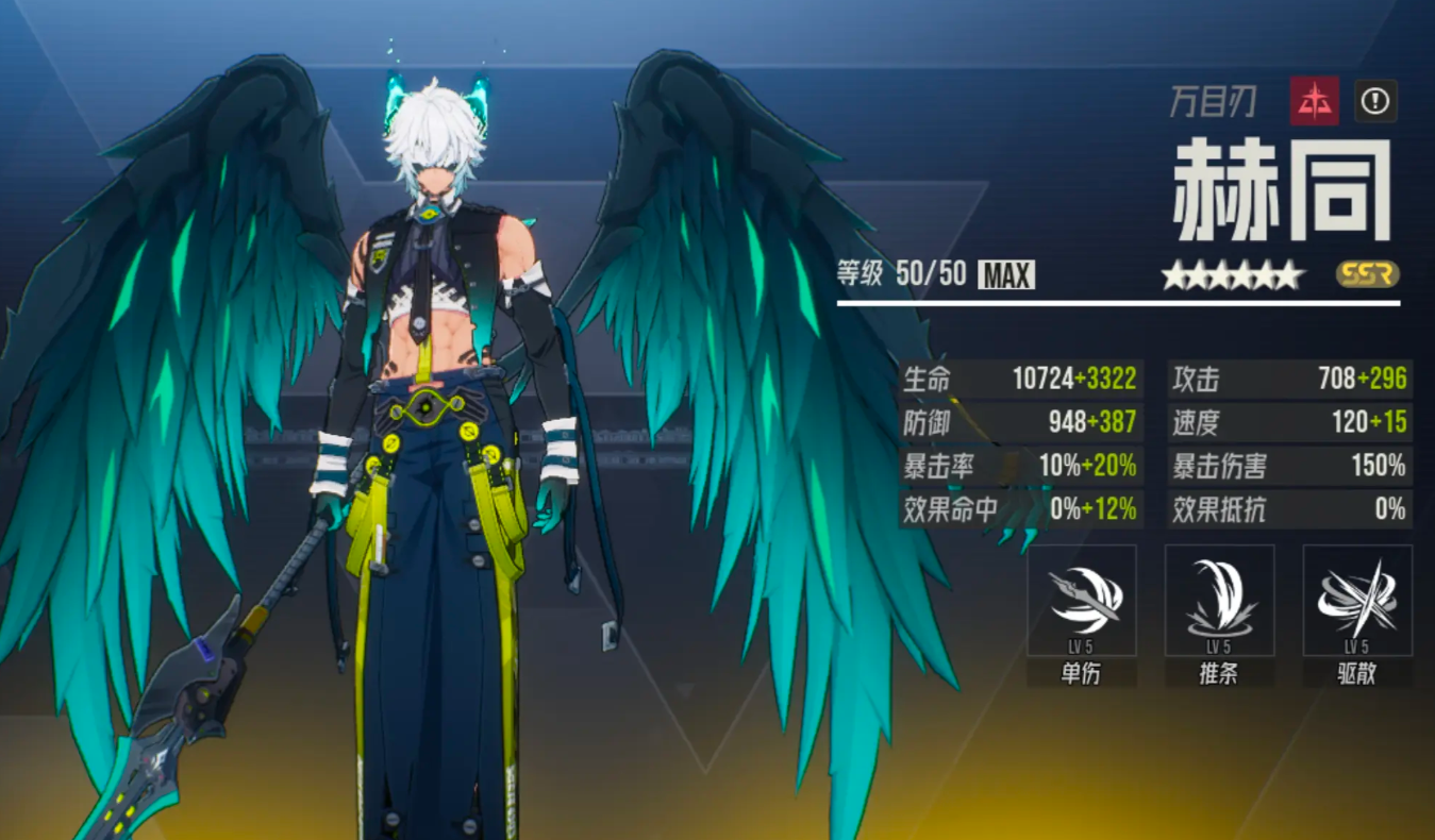 赫同是一名兼具反击输出与驱散能力的独特战士。其被动技能可在战斗开始时获得500点防御力,并提升12%反击率与6%伤害。“散流刑”技能对单体敌人发动三次攻击,每次造成125%防御力的伤害,每段攻击均有25%概率降低敌方防御。