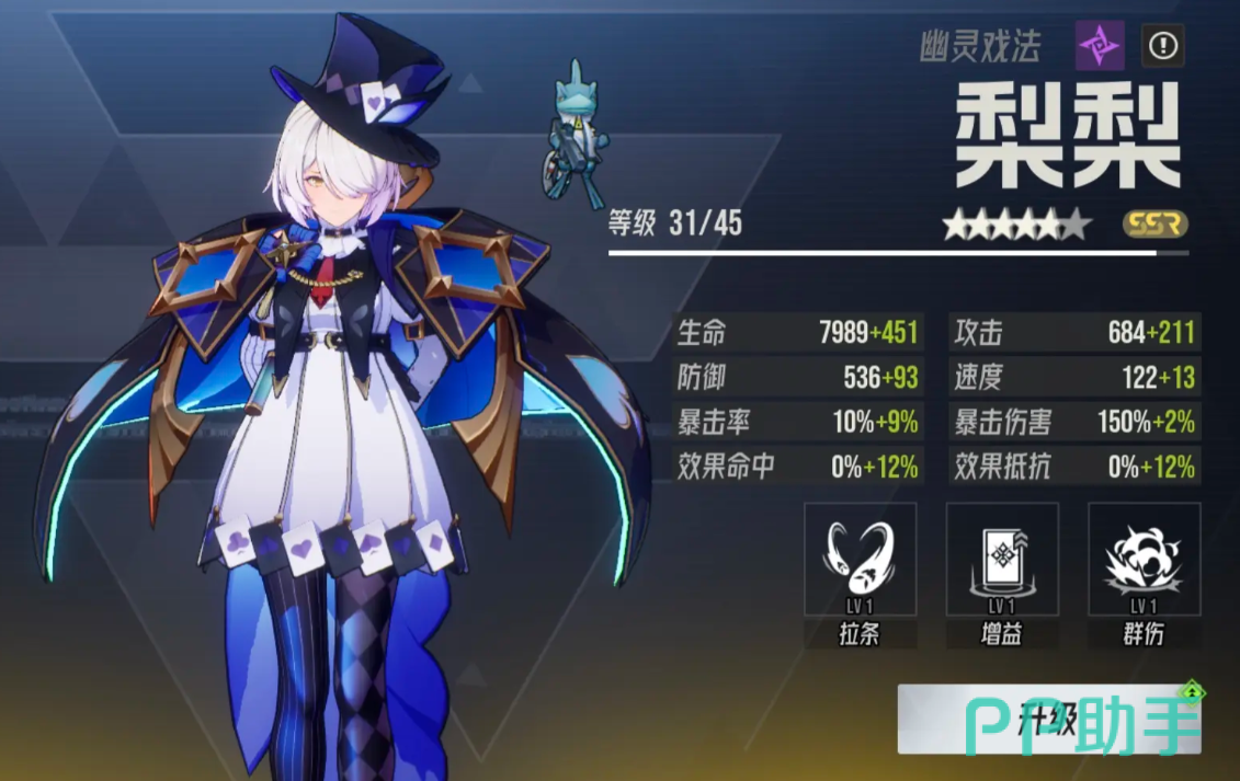 当前版本公认的T0级辅助角色,梨梨不仅能显著提升队伍行动频率,还兼具冷却缩减与暴伤强化的复合型增益能力。“帽子”技能可对单体敌人发动攻击,成功后有50%几率提升自身及行动进度最低的队友20%行动条,并确保携带“双生”状态的队友必定参与战斗。