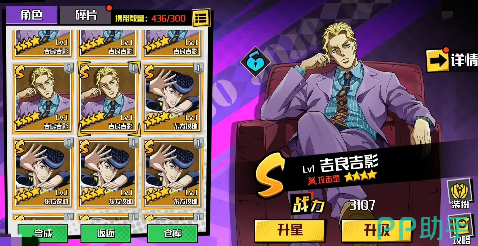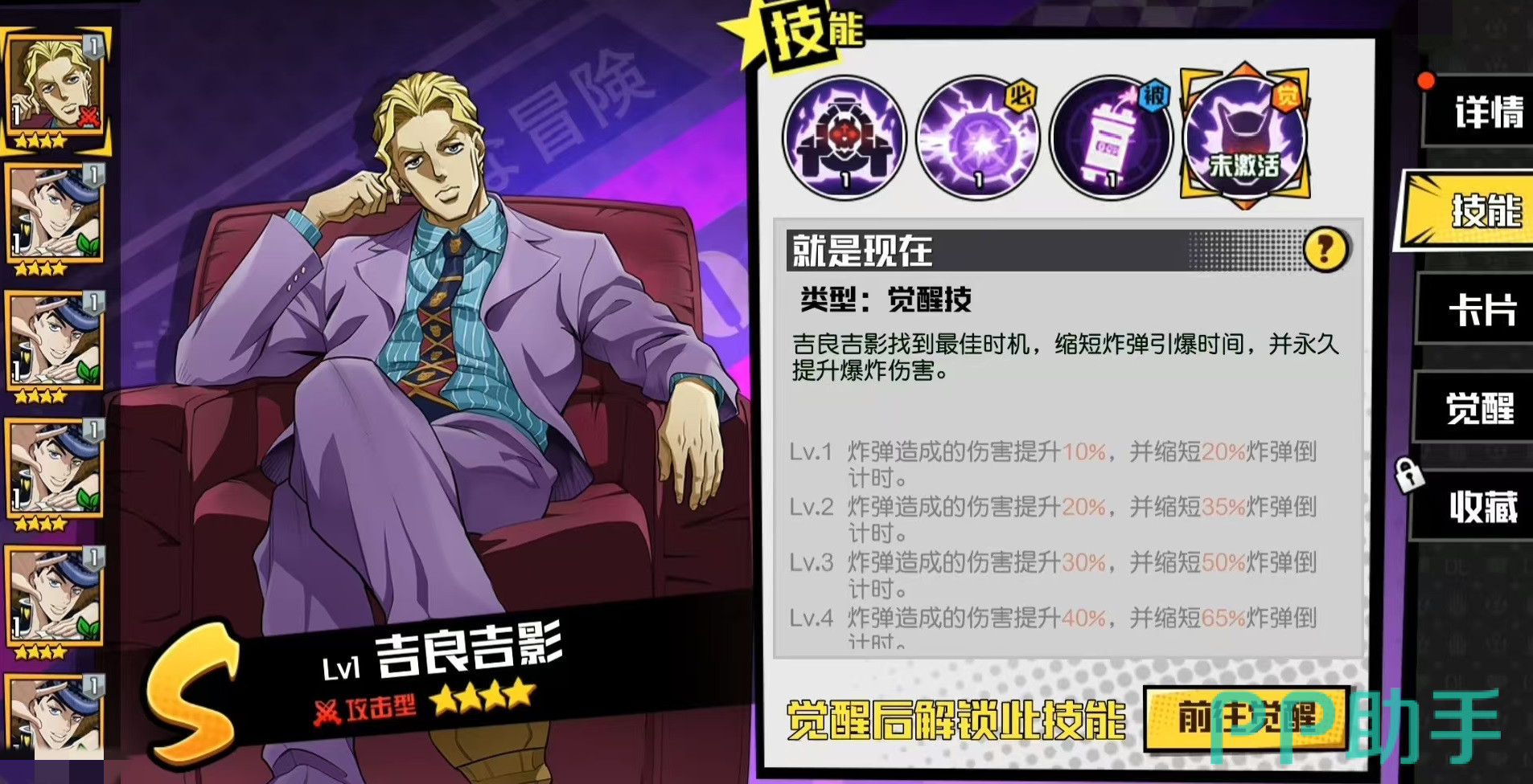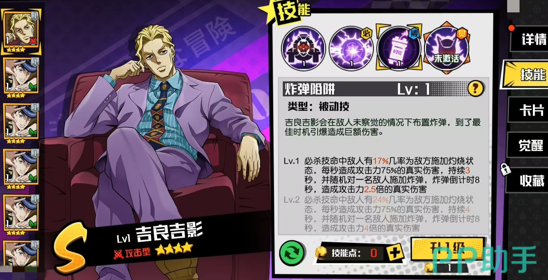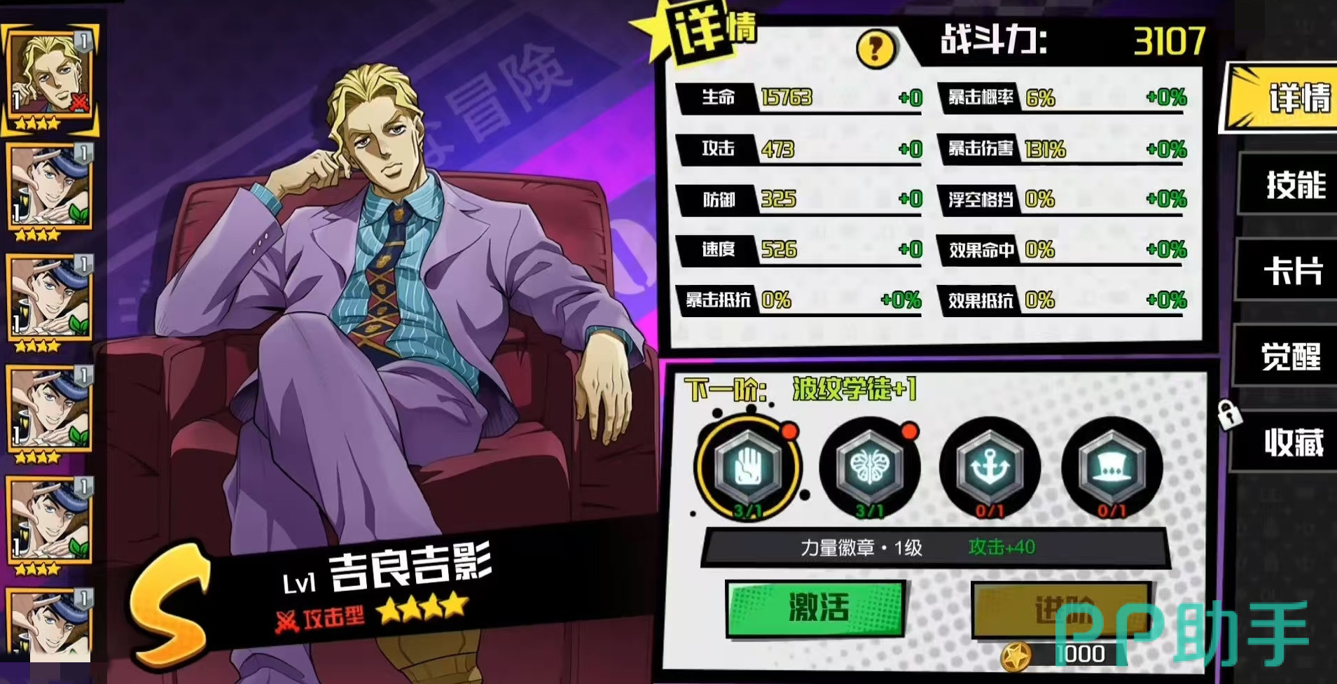 今天为大家带来的是《JOJO的奇妙冒险》手游中的一位强力攻击型角色——S级四星人物吉良吉影。作为游戏中极具代表性的输出角色,他在实战中的表现非常亮眼,接下来将详细介绍吉良吉影的技能机制与使用技巧。