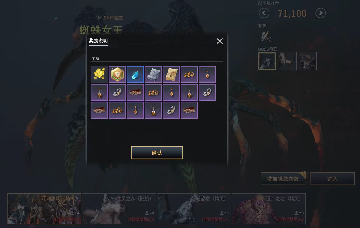 第一类为单人副本,每日提供一次基础奖励机会,消耗特定道具可额外开启两次。该类副本主要掉落经验材料、金币、白金货币及魔力根源等成长资源。战斗中需注意规避环境伤害——蜘蛛主题副本会释放持续扣血的毒雾区域,应避免停留;石头人关卡则伴有岩浆地形,同样会造成高额伤害,建议灵活走位并远离大范围技能覆盖区。第二类是随机副本,采用四人组队形式,系统内置佣兵匹配功能,即使缺少队友也可自动补全。每日基础挑战次数为两次,使用道具可追加三次。产出包括武器、首饰、强化石、金币与设计图等实用物品。整体难度较低,配合AI队友也能轻松通关。