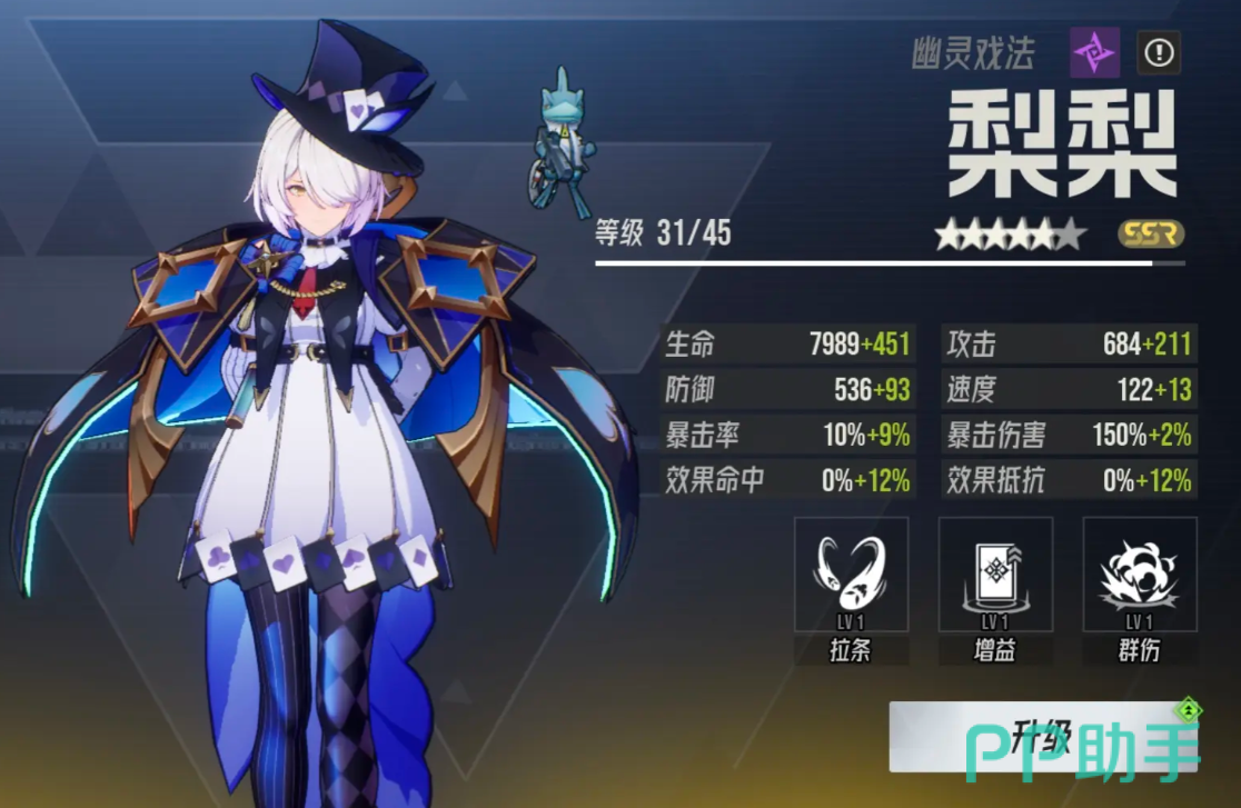梨梨是团队节奏调控的关键辅助,拥有加速全队行动、重置技能冷却以及提供暴击伤害加成的能力,适配绝大多数阵容配置。“帽子”技能可对敌方单体造成240%伤害,并有概率为自身与行动进度最低的队友增加20%行动条,若存在携带“双生”状态的队友,则助战触发率为100%。“迅影”能为一名队友施加“双生”效果,在接下来2回合内使全体队友速度提升30%;若目标已具备“双生”,则改为使其获得3回合50%暴击伤害加成并立即获得行动回合。