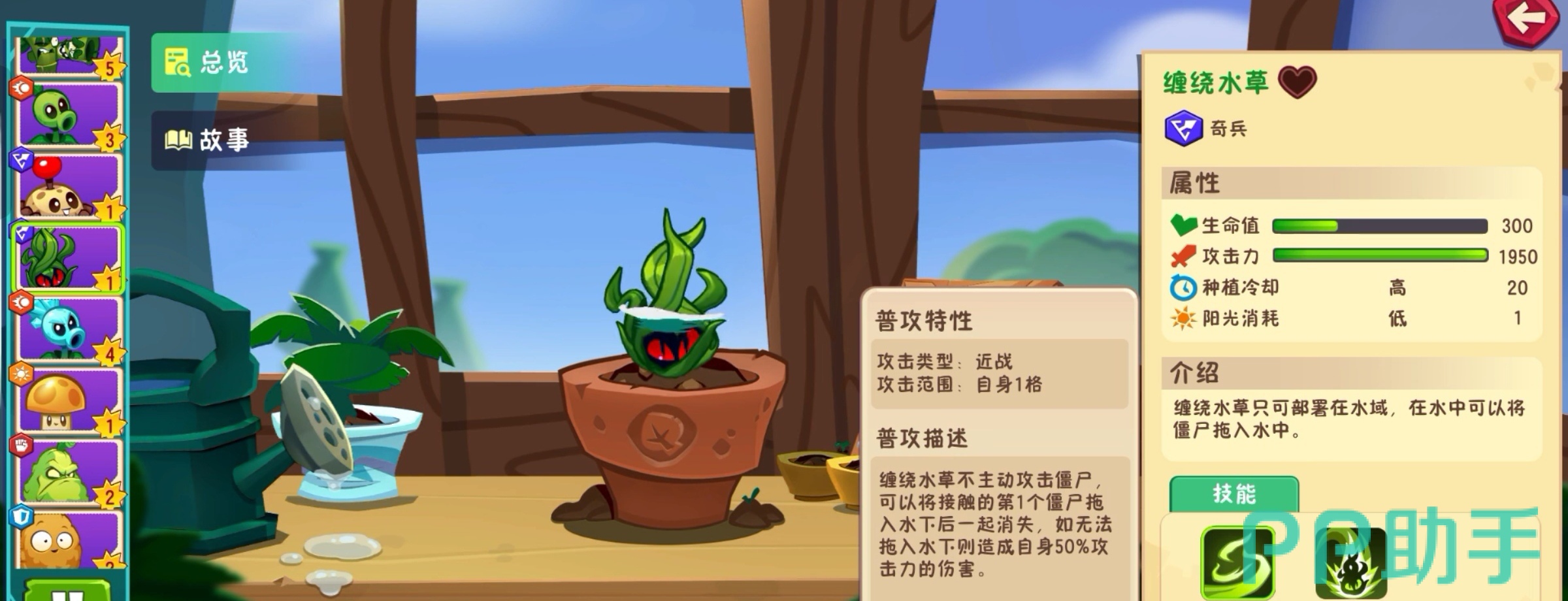 备选植物一:缠绕水草。该植物可同时攻击同一航道前后两个空中单位,特别适用于水域地图作战。使用时必须将其种植在浮水叶上才能生效,是水面关卡中的关键对空手段。