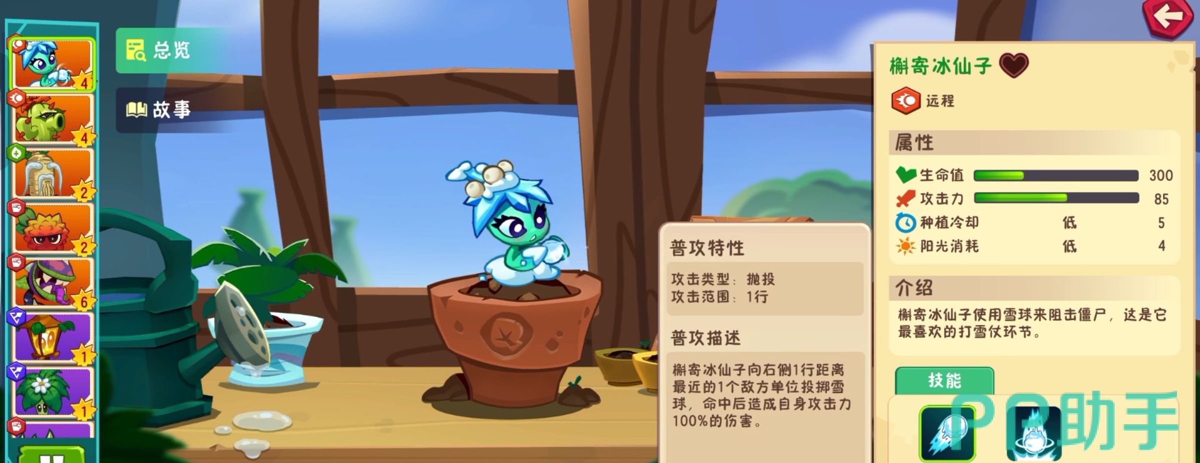 核心控制植物:檞寄冰仙子(需升至三阶及以上)。其冰属性弹药可对空射击,并附带减速效果,为后续高伤植物创造二次输出机会。虽然单体伤害不及仙人球,但控场能力突出,常与闪电芦苇搭配形成“减速+连锁打击”的高效组合。
