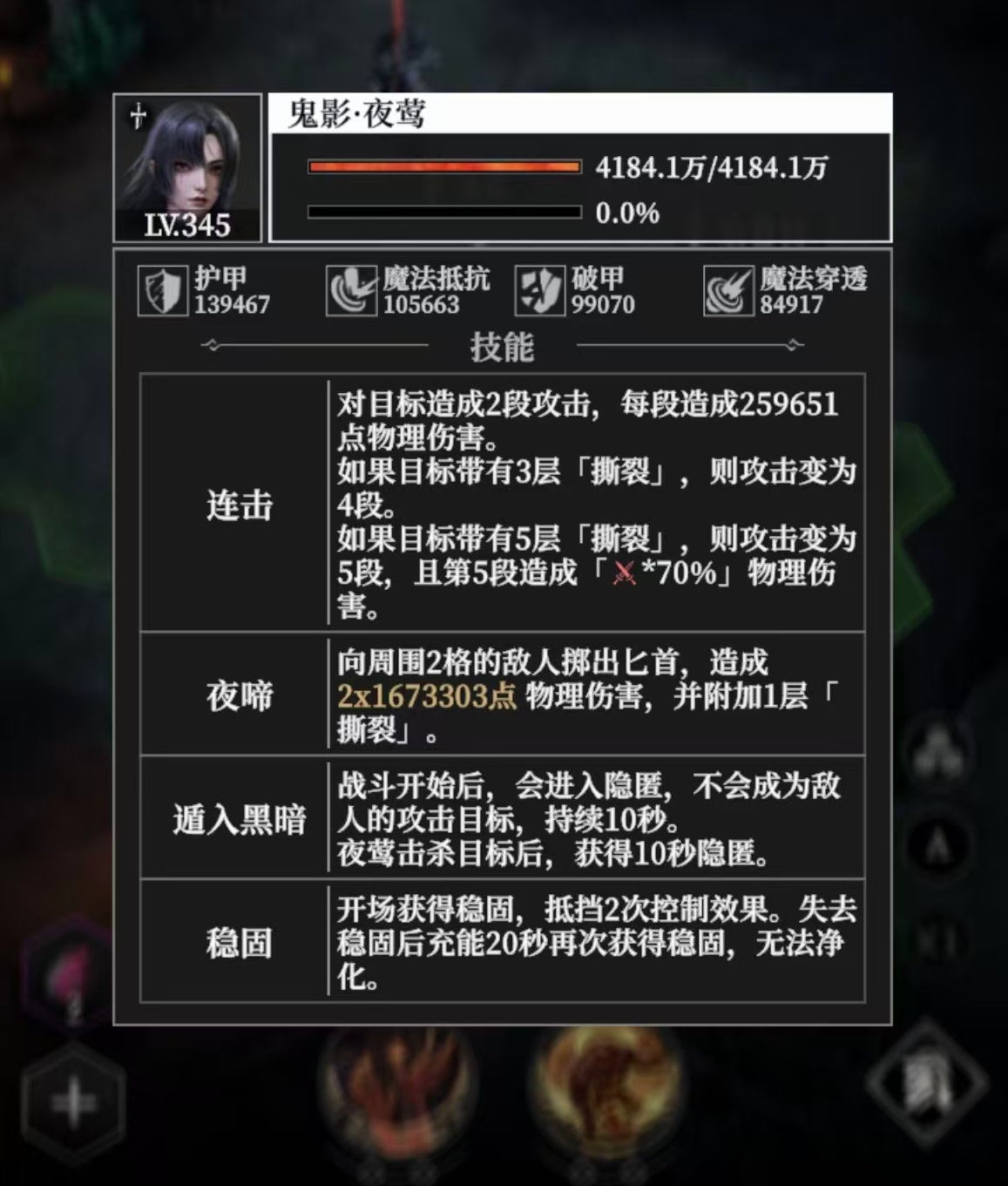 夜莺作为暗影阵营的一员,最初登场于《地下城堡3》,在本作的番外篇章中再度回归。她不仅是章节中的强力BOSS,也是玩家通关后可获得的重要刺客单位。其核心技能包括“连击”和“遁入黑暗”。其中,“连击”能对敌人造成两次基础伤害,若目标已处于“撕裂”状态,则会转化为多段攻击,且撕裂层数越高,触发的额外伤害越显著。“遁入黑暗”则使她在战斗开始时立即进入隐匿状态,无法被敌方锁定,只有被特定手段破除隐身才能受到攻击。此外,每当夜莺成功击杀单位后,将再次进入持续隐匿状态,并获得控制免疫效果,这使得她在战斗中极具威胁。