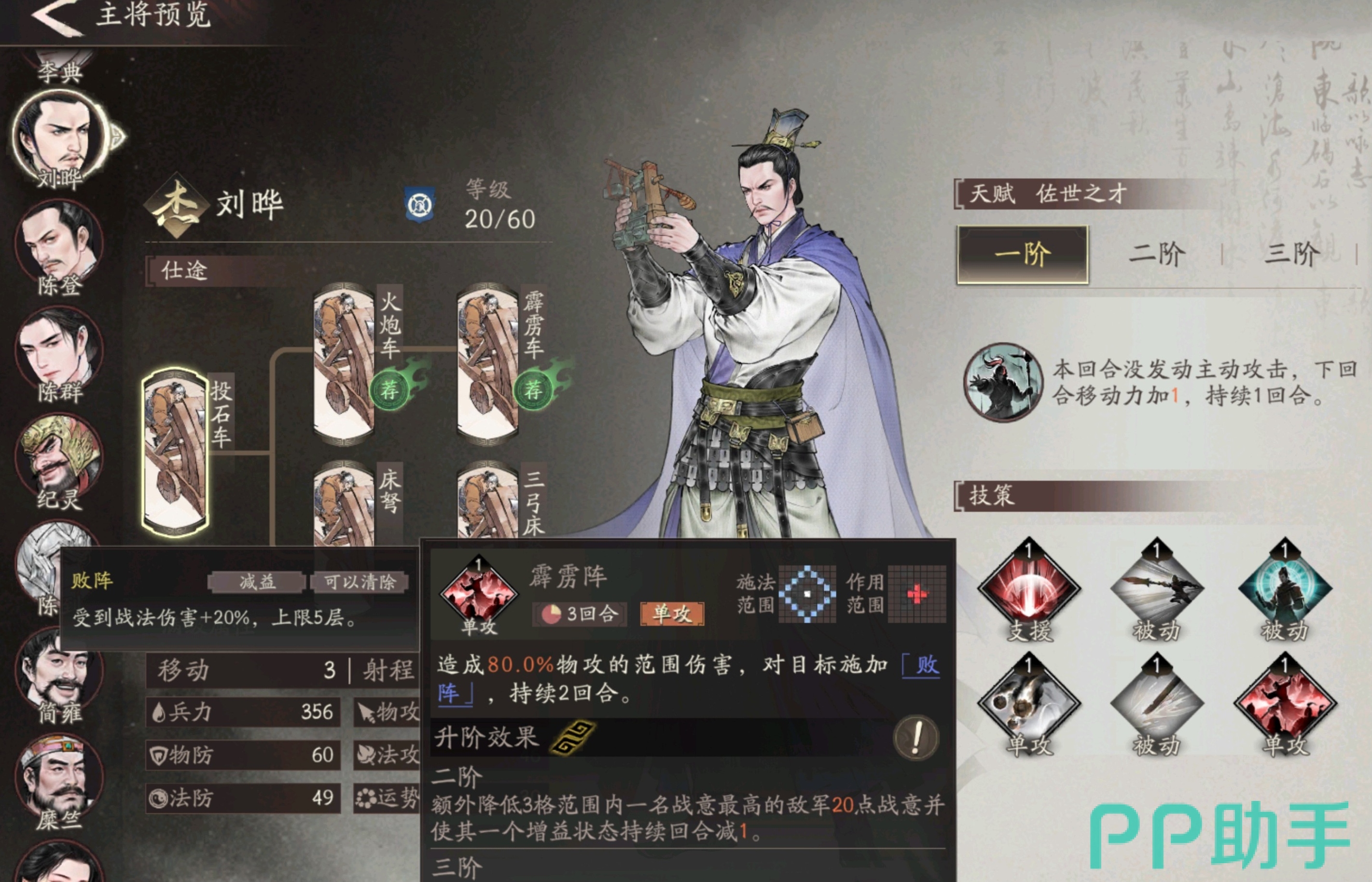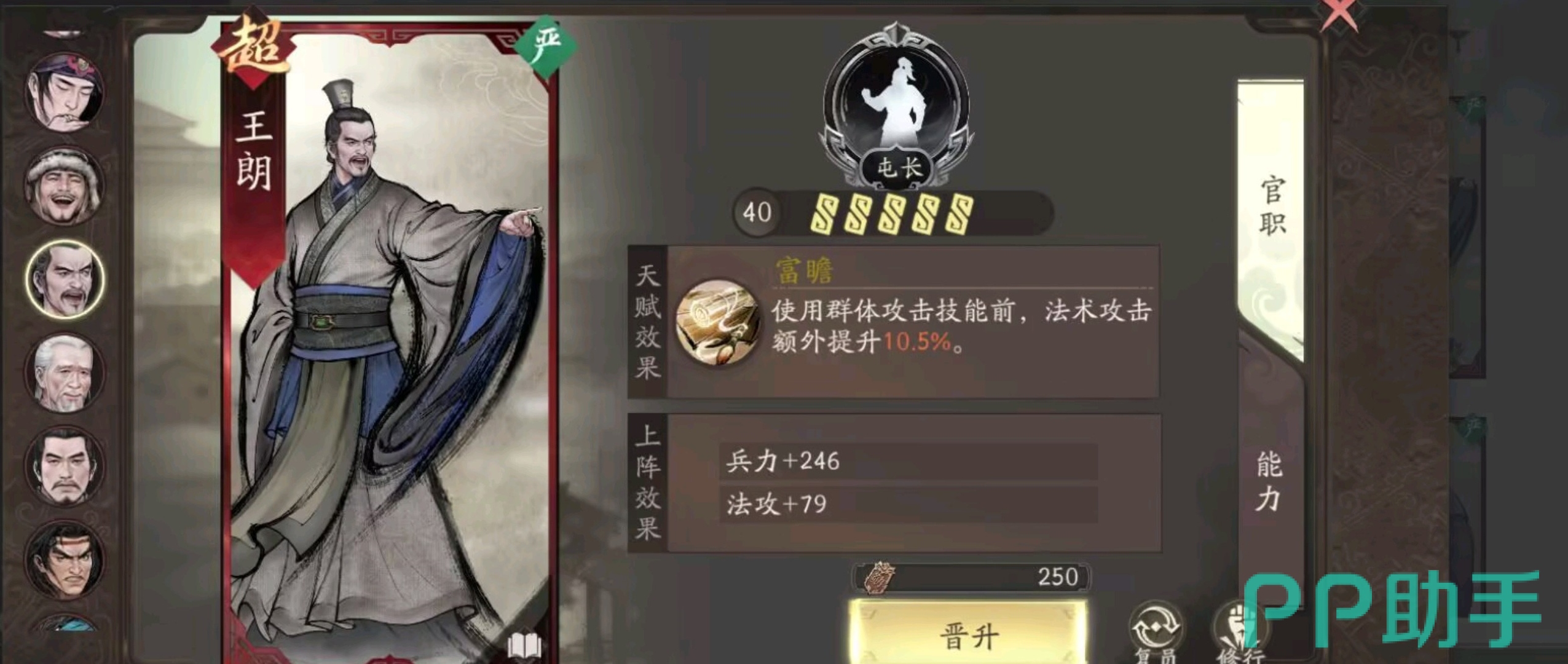 进入后期阶段,可考虑将副将替换为卞氏或王朗。其中王朗的技能“富瞻”在释放群体攻击技能前,可使法术攻击力提升10.5%,适合缺乏爆发输出的阵容使用。总体而言,貂蝉适配性强,几乎不依赖特定队友,通用推荐阵容为:夏侯惇+曹操+貂蝉+张辽/吕布+陈群+刘晔。