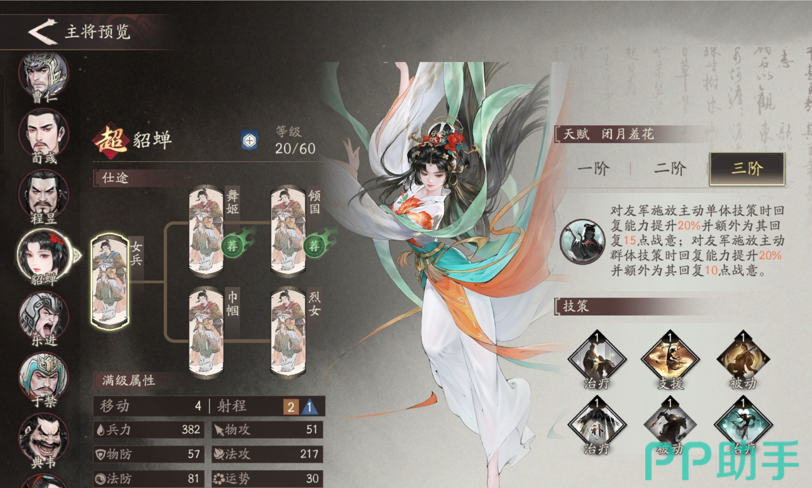 其核心天赋【闭月羞花】效果为:当对友方单位释放单体主动技能时,自身回复能力提升20%,并额外为该目标恢复15点战意;若释放群体主动技能,则按比例提升回复效能,并为全体目标额外回复10点战意。