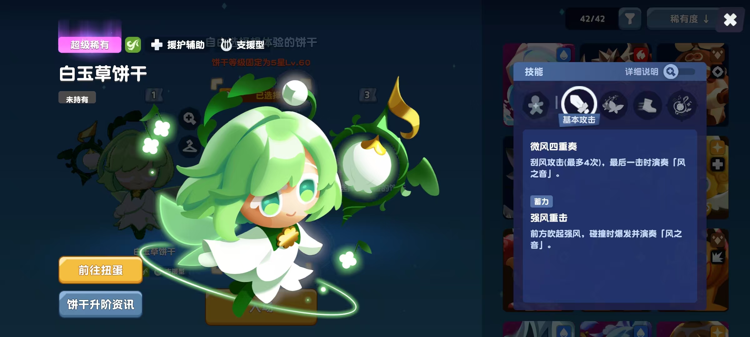 她的普通攻击最多可进行四段连击,最后一击有机会释放最多2个风之音,各次攻击的伤害分布较为均衡。蓄力攻击则向前方释放一股强风,命中目标后产生爆发,并演奏最多2个风之音,该攻击方式拥有较高的基础伤害。特殊技能“风之重击”使白玉草向前冲刺并演奏3个风之音,若路径中接触到己方饼干人,可为其附加风之音状态。长按技能按钮可维持冲刺状态,在此期间最多触发2次风之音效果。该技能冷却时间为12秒,风之音的持续时间为15秒,具有良好的覆盖率和衔接性。