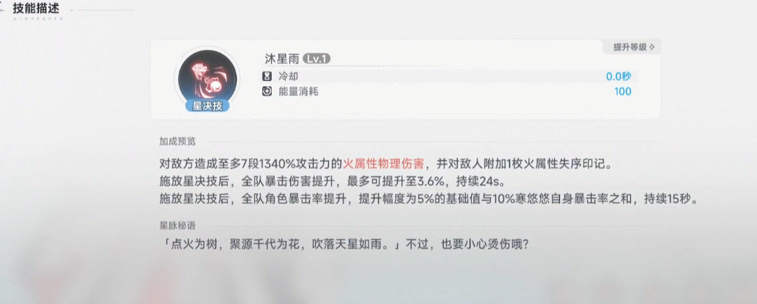 她的元素爆发为七段高倍率火属性物理伤害,并附加一层“火属性失序”debuff。释放大招后,全队暴击伤害提升,持续时间为24秒;同时队伍成员暴击率获得增益,提升数值为5%基础值加上寒悠悠自身暴击率的10%,持续15秒。这一双重增益极大增强了主力输出角色的爆发能力。