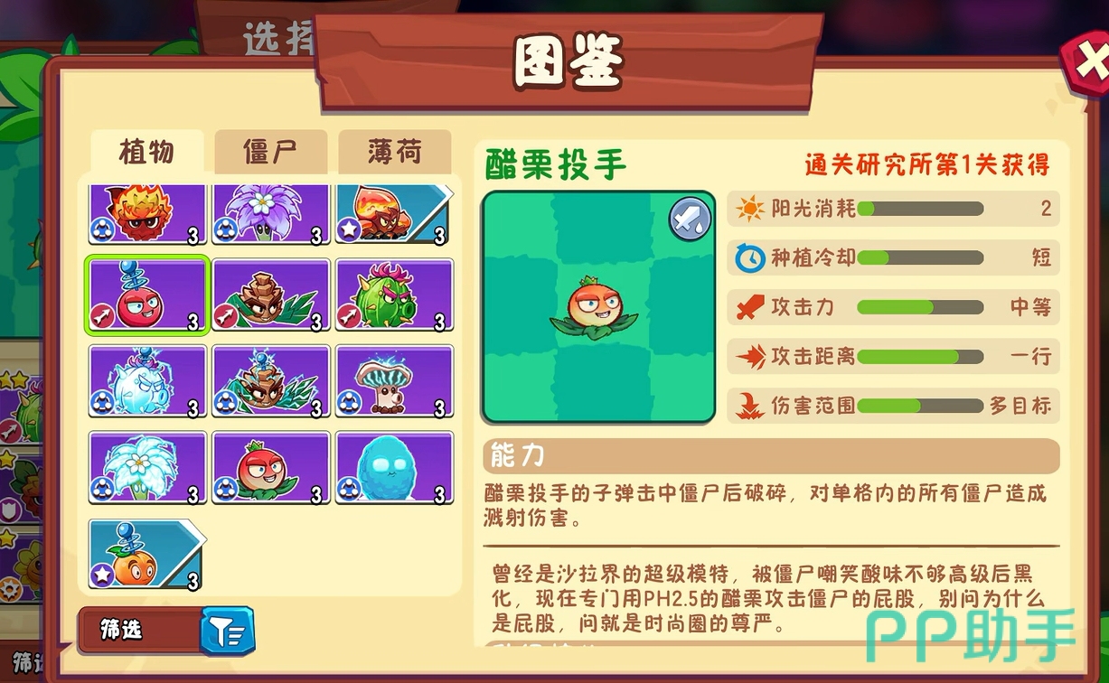 想要获取醋栗投手,只需顺利通关研究所的第一关即可。由于该关卡难度较低,新手也能轻松通过,因此该植物几乎在游戏初期就能入手。醋栗投手在攻击时会以抛物线形式投掷醋栗,命中目标后对主要敌人及其周围小范围内的单位造成溅射伤害。它具备阳光消耗极低(仅需2点阳光)、种植冷却短、单体输出可观且附带群体打击能力的优点,综合表现优于传统基础射手类植物,可作为主力输出进行广泛部署。