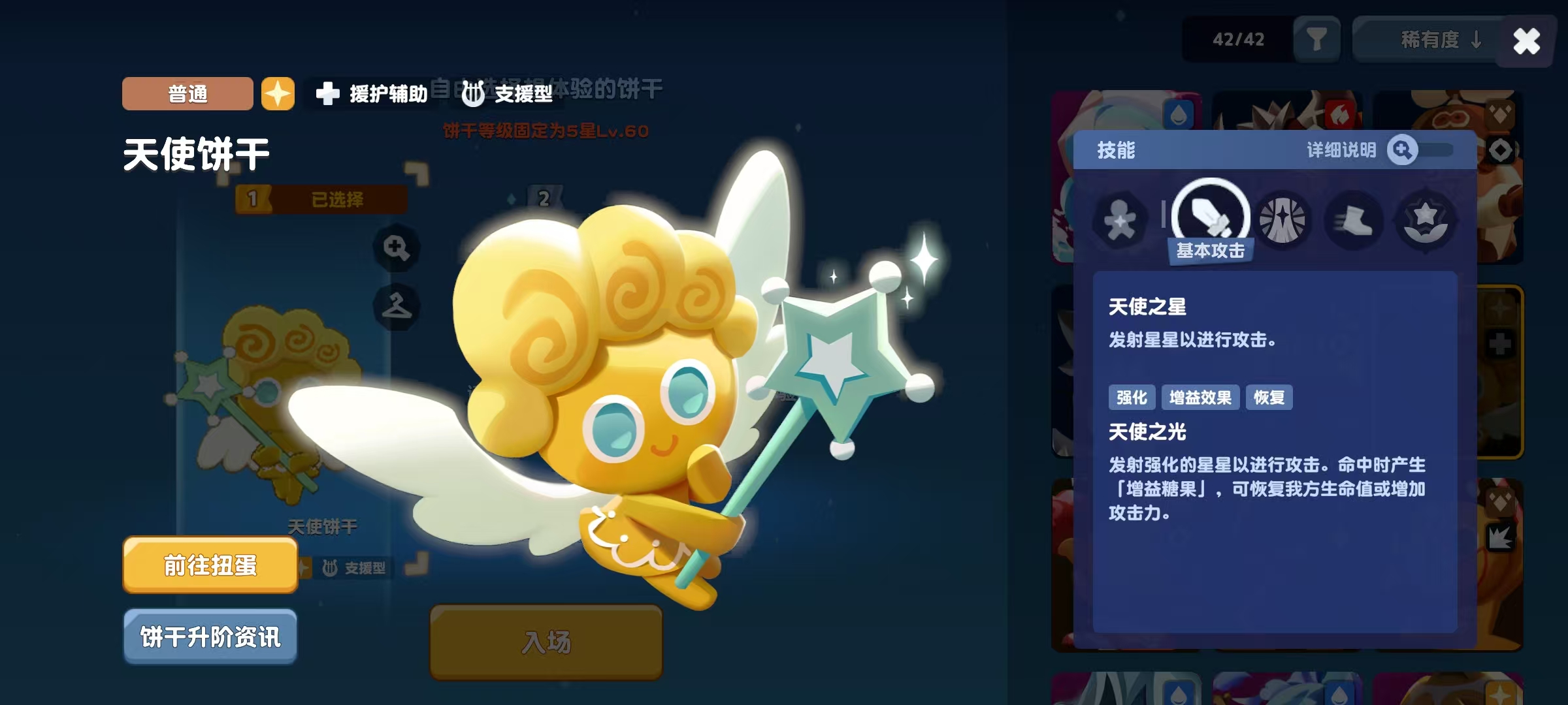 首先来看天使饼干的被动技能——温柔信念。每当它的攻击命中敌人时,便会叠加一层该效果,最多可累积5层。当层数叠满后,下一次普攻将触发强化形态。常规状态下,基础技能“天使之星”能造成160%的伤害;而在触发强化后,此技能将升级为“天使之光”,不仅伤害提升至210%,还会在命中目标时生成增益糖果,为己方单位恢复相当于其最大生命值4%的生命,并附加持续10%的攻击力加成,兼具续航与输出辅助能力。