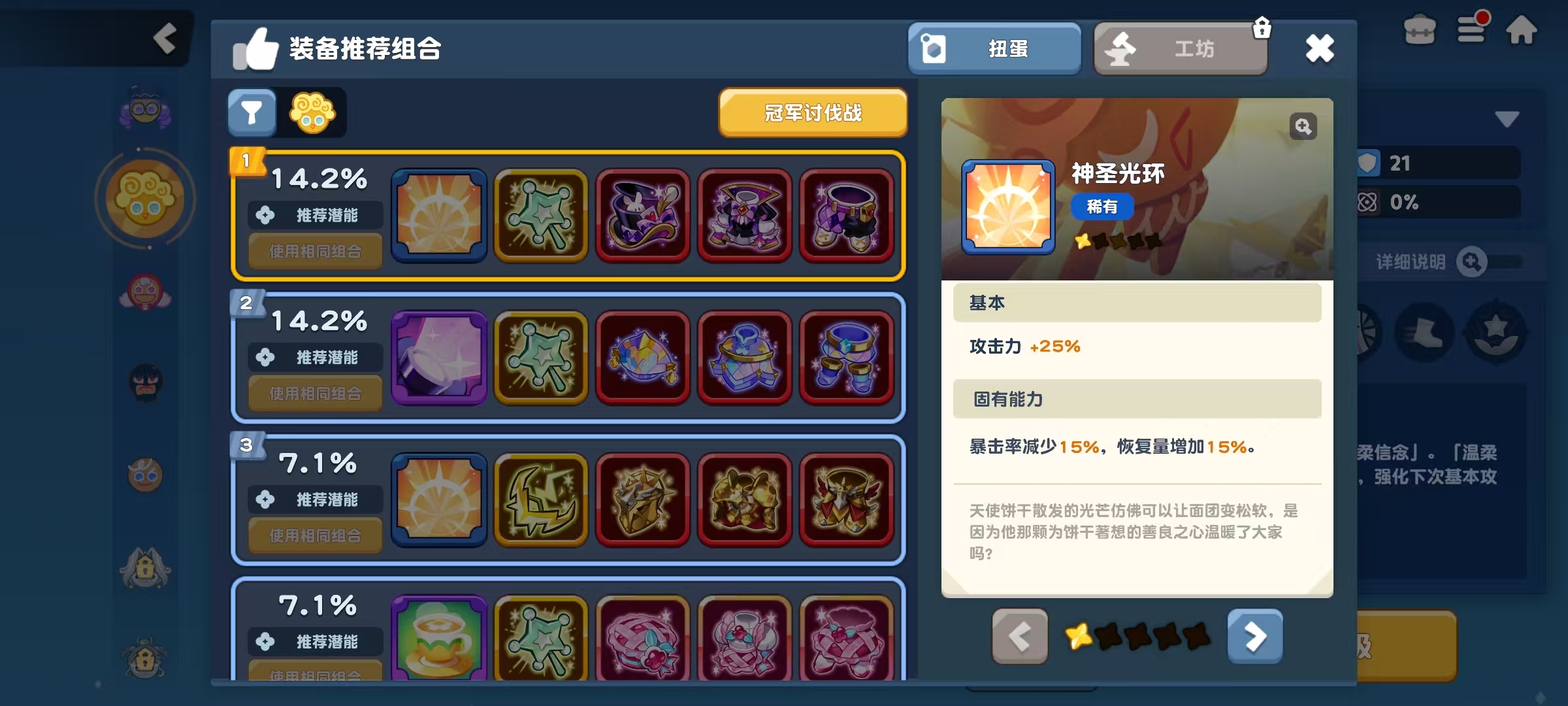 为了最大化天使饼干的辅助效能,装备和法宝的选择尤为关键。推荐法宝卡为“神圣光环”,该卡牌可提升攻击力、降低暴击率,并显著增强治疗效果,非常适合专注于支援定位的角色。武器方面,“星光绽放天使棒”是首选,不仅能提高攻击力,还能进一步扩大恢复量。防具套装建议选用“永恒大魔术师帽”、“永恒大魔术师上衣”以及“永恒大魔术师裙”。该套装具备协同增益效果:当周围队友的属性与穿戴者相同时,可提升其对应属性的伤害输出,进一步强化团队整体作战能力。