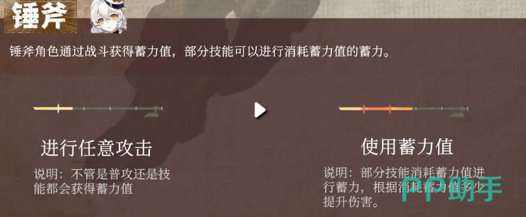 锤斧武器的核心机制围绕“蓄力值”展开。人类阵营的角色在施展特定攻击动作后,能够有效积累蓄力值。该系统设有五个独立格数的充能条,通过普通攻击或技能命中目标逐步填充。每当成功叠加一层蓄力值,角色便获得一次阶段性的强化效果。随着数值累积,整体输出能力也会随之提升,体现出明显的成长性特征。