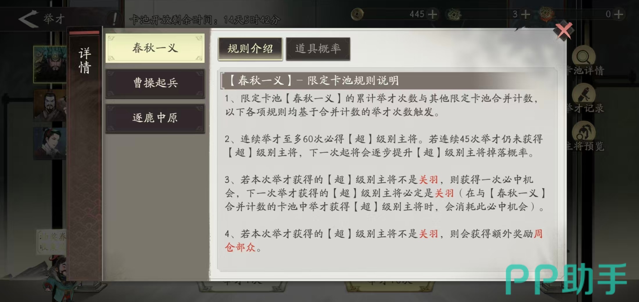 接下来介绍限定卡池机制。游戏会围绕特定剧情或主题推出限时卡池,如“爱恨英豪”等,此类卡池中的抽取次数将与其他限定池累计计算,所有保底规则均基于总抽取数生效。在限定池中,最多60次抽取内必定获得一名超级别主将。若连续抽取达45次仍未获得,则后续每次抽卡都会逐步提高超品主将的掉落概率。若所获超品主将非当期限定角色(如张飞),则系统将赋予一次“必得”资格——下一次获取的超品主将必定为限定人物。此外,在“爱恨英豪”池中,张飞的获取概率相较其他池子提升50%,抽取效率显著增强。同时,达成指定抽取次数还可领取夏侯昭等额外奖励,助力玩家快速构建版本强势阵容。