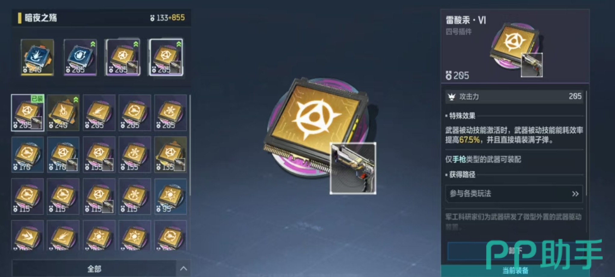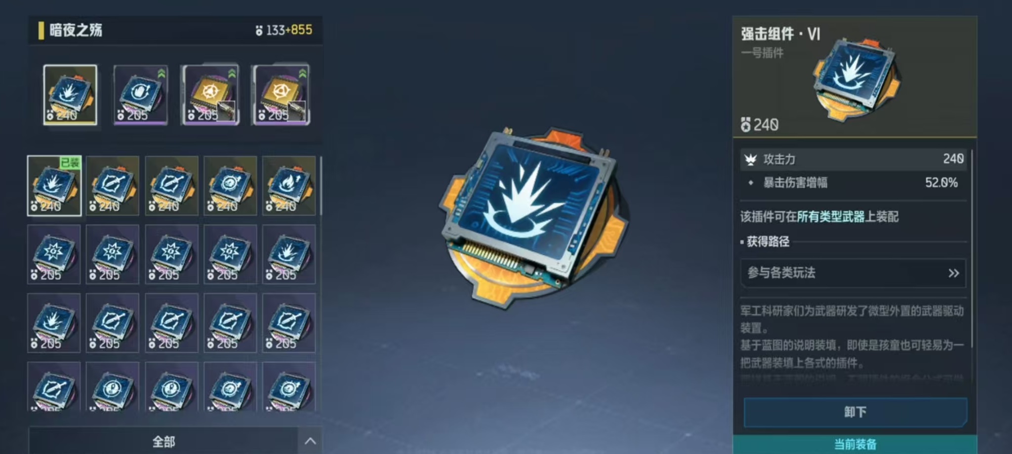尽管浪里白条拥有出色的单发威力和射程优势,但其能量续航相对有限,持续作战能力较弱,因此更适合节奏紧凑、爆发为主的对局环境。为了最大化输出效率,玩家可根据战术需求选择不同的插件组合:追求瞬间伤害时,推荐使用橙色增伤插件与紫色暴击插件;若希望延长作战时间,则蓝色吸血插件与紫色减CD插件是更优选择。