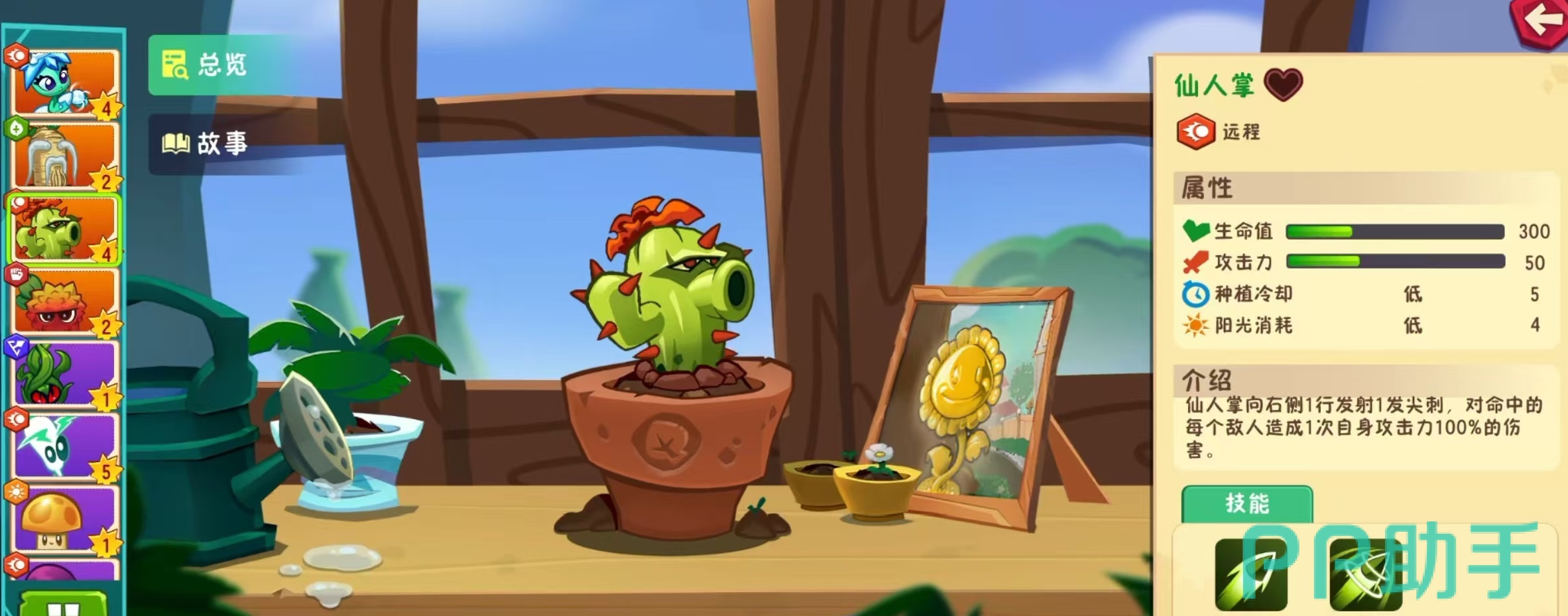 除了常规攻击外,仙人掌还具备一项强力技能——贯穿子弹。该技能属于能量自动回复类型,可通过手动激活释放。启用后,植物会向前方一行连续发射50发具备穿透效果的强化尖刺,每发均能对命中的每个敌人造成100%攻击力的伤害。此技能特别适用于清理密集僵尸群或对抗高血量精英单位,能在短时间内实现整行清场,极大提升战斗效率。