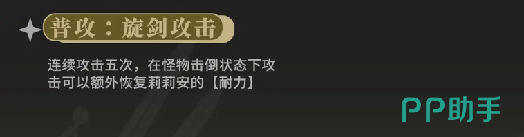 从战斗机制来看,莉莉安具备出色的持续输出能力。她的普通攻击为“悬剑连击”,可连续发动五段攻击,比常规角色多出两次连击次数。当敌人处于倒地状态时,该系列攻击还能为莉莉安恢复一定量的耐力值,从而增强其续航作战能力。此外,她的魂技可在释放过程中强化普攻形态,激活“旋剑”效果,进一步提升整体输出效率。