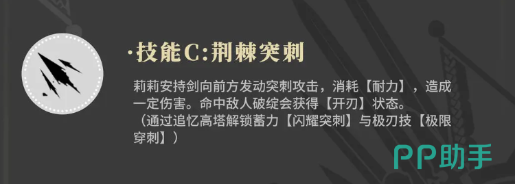 技能三“荆棘突刺”则是一种位移型攻击手段,莉莉安向前快速突进并以剑刃进行穿刺打击,该过程同样依赖耐力支持。若成功命中敌人的破绽部位,则可触发“开刃”效果,为后续技能衔接创造有利条件。特别是与“闪耀突刺”配合使用时,能显著提高连招流畅度与伤害总量。