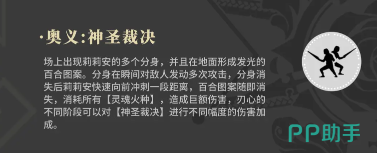 她的终极技能展现出了极强的视觉冲击力与实战价值:释放时会出现多个分身,均布于战场之上,地面随之浮现百合形状的光纹。这些分身会在技能持续时间内不断对范围内敌人发起高频攻击,无法被轻易分辨真身所在。待技能结束时,所有分身消失的同时,莉莉安本体将执行一次强力前冲,拉开与敌人的距离,确保安全撤离。