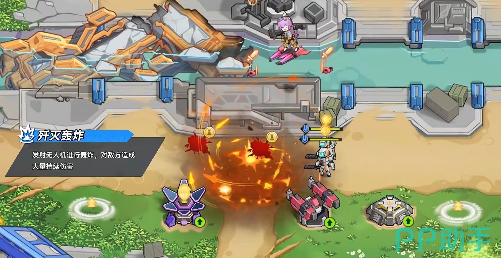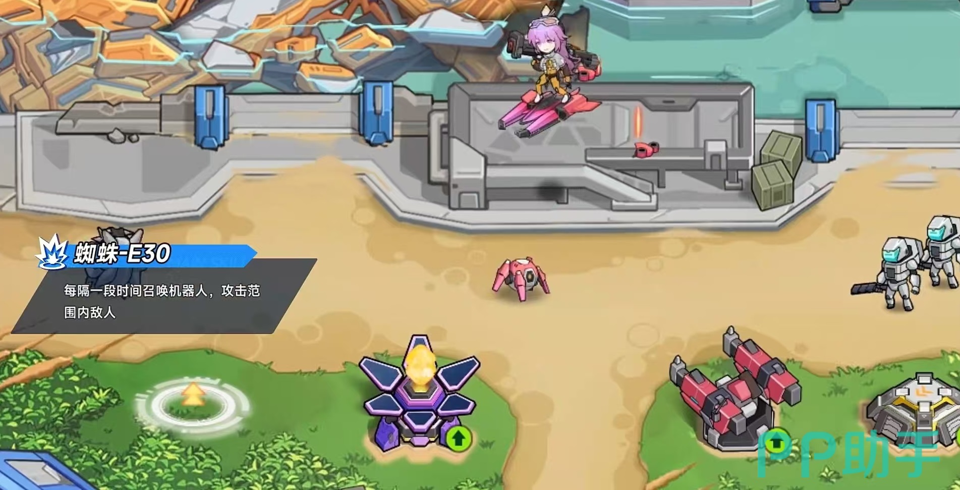 伊莉丝的核心特质为高原增幅,具备出色的机动性,并以空中滑行为主要行动方式。她的第一个主动技能名为歼灭轰炸,能够释放无人机对敌方区域进行持续打击,虽然单次伤害偏低,但累计输出极高,属于团队中稳定的范围伤害来源。第二个技能蜘蛛E30,则可周期性召唤战斗机器人,这些单位会自动锁定周围敌人并展开攻击,进一步增强清场效率。