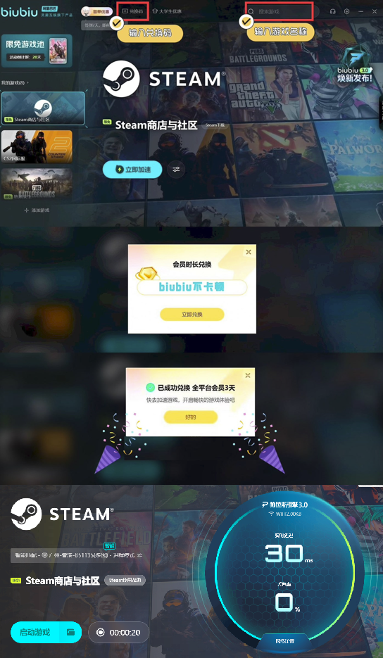 首次注册用户点击上方按钮下载最新版本即可自动获得24小时免费加速时长,若在客户端内输入兑换码“biubiu不卡顿”,还可额外领取3天免费服务,总计享受长达四天的完整加速体验。除此之外,biubiu还会不定期推出热门游戏的限时免费加速活动,覆盖范围广泛,助力玩家无延迟畅玩各类大作。