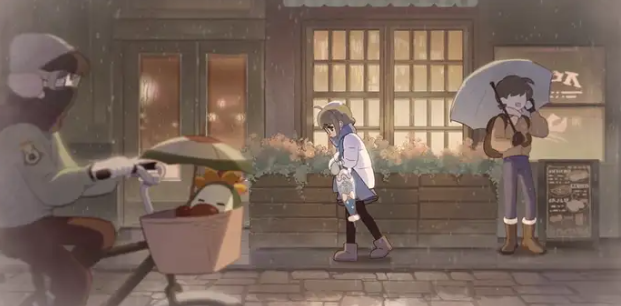 不仅仅是下雨天,在下小雪的时候自己冷得够呛,还是会保护安布蕊娜,安布蕊娜这些细节全部都会看在眼里,所以也会很尊重小雅的陪伴。直到有一天下大雨,小雅还想着自己撑着伞,然后保护他,结果他直接就变成了长柄阳伞,然后反过来帮助小雅挡雨。要知道之前是多么怕事,这样的改变也会让人觉得有一些泪目。从pv的对话就觉得很有画面感,原本小雅的性格是很内向的,但是在彼此的陪伴之下也变得更加的开朗,这可能就是双向奔赴的改变。