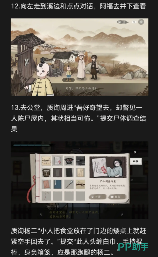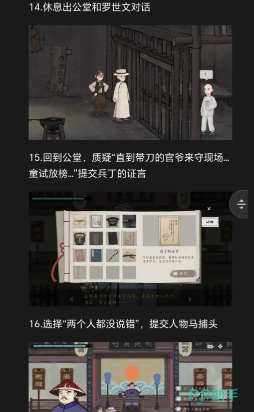 接着往左边走,能看到高点跟他聊两句,他会提醒“水井那边好像有东西”,这时候赶紧去水井旁边仔细看,蹲下来扒拉扒拉能找到个挺关键的证物,拿到手就知道这东西能跟周老先生的话对上,左边逛完就得回去找老童生了,庭审休息那段时间千万别闲着,正好补线索,到跟周老先生对质,之前收集的所有线索都得调动起来,跟周老先生聊完,他会把知道的事都告诉,还会给一个新的线索,这个线索能帮玩家在后面反驳马捕头。